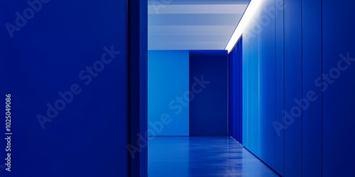 © pham, Obraz premium 淡い青色の壁に囲まれた静かな廊下が光で照らされている様子を示しています