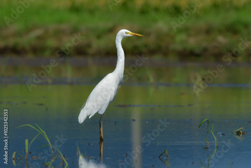 Obraz premium 初夏から夏に田んぼや水辺で見られる身近な野鳥ダイサギ