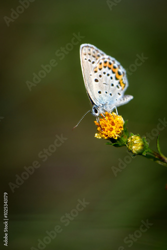 Obraz premium 秋に川原や草原で見られる青紫色の小さな美しいチョウ、絶滅危惧種のミヤマシジミ