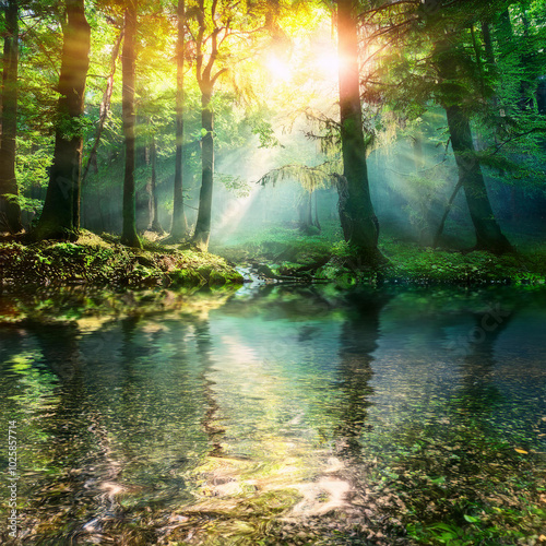Obraz premium 光が差し込む幻想的な森の小川