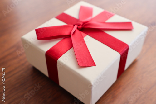 © sakurasaku, Obraz premium 机の上に置いた赤リボンのプレゼントボックス