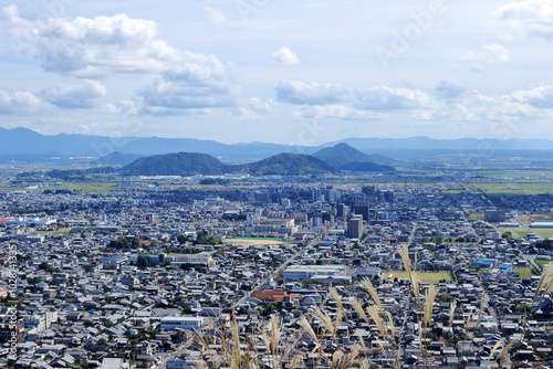 Obraz premium 近江八幡山城の出丸跡のすすき越しに見る近江八幡市の風景