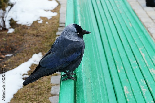 Obraz premium Галка на зеленой скамейке