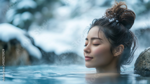 © bephoto, Fototapeta premium 温泉でリラックスする日本人女性