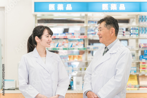 Fototapeta premium 薬局・病院・ドラッグストアで働く薬剤師(処方箋・薬・サプリメント)