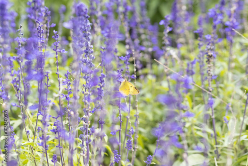 Naklejka premium サルビアの花にとまるモンキチョウ