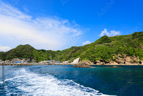 © d3_plus, Fototapeta premium ヒリゾ浜渡船の漁船に乗って、海に出るスキンダイバー、シュノーケラーたち。静岡県伊豆半島賀茂郡南伊豆町中木ヒリゾ浜 2024年