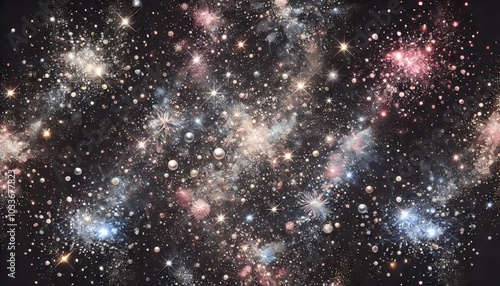 © CreativeVirginia, Obraz premium 暗い背景に広がるきらめくグリッターの構成で、輝く粒子や反射が星空のようなダイナミックで輝かしい効果を生み出しています。