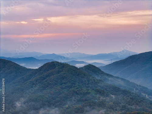 © harangdrone, Fototapeta premium 운해가 가득한 산 정상에서의 일출