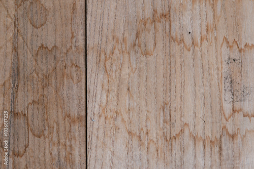 Naklejka premium 液体のシミが残る乾いた木材板の表面 テクスチャー背景壁紙 汚れた・汚い模様の板