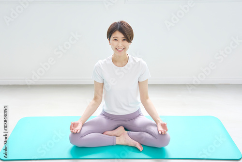Fototapeta premium ヨガで坐禅をするミドルエイジの女性 カメラ目線