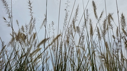 Obraz premium 흐린 가을날 구름이 있는 하늘 배경으로 무르익은 강아지풀 근접