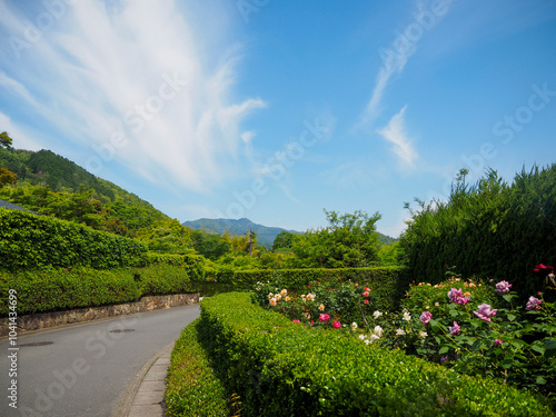 Obraz premium 新緑と花が鮮やかな京都市右京区嵯峨野の通り