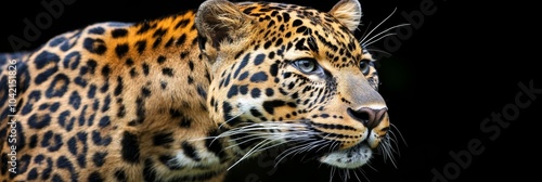 © pham, Obraz premium ジャガーが黒い背景の前でじっと見つめている瞬間、野生の魅力を感じる