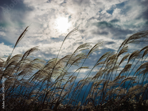 © Akio Mic, Obraz premium 空の下のすすきと秋の自然風景 徳島県 塩塚高原