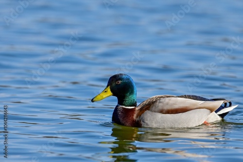 Obraz premium 青空映す水面をのんびり泳ぐマガモ オス