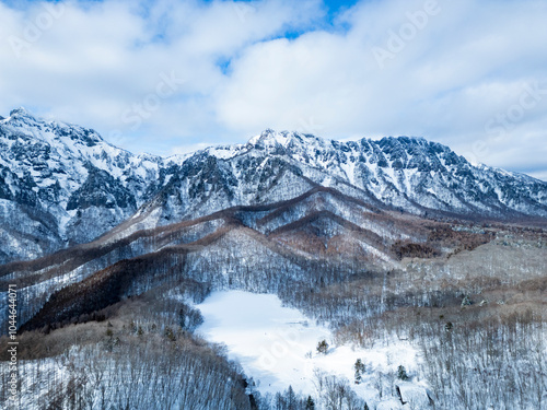 Fototapeta premium 冬の鏡池と戸隠連峰(ドローン空撮) 長野県長野市戸隠