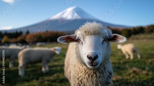 © chic designs, Fototapeta premium 雄大な雪山のある田園風景の中で放牧されている羊