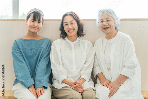 Obraz premium 座って話をする三世代親子(孫・母親・おばあちゃん)