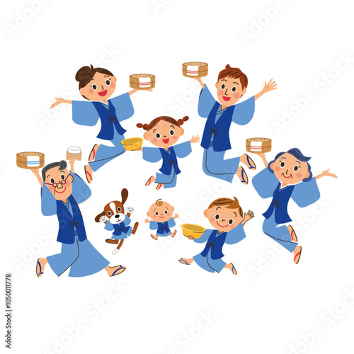 Naklejka premium 温泉に行って浴衣を着てジャンプする三世代家族