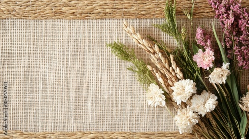 © chic designs, Obraz premium 春の装飾と環境に優しいデザインのための黄麻布の素朴なフラワーアレンジメント