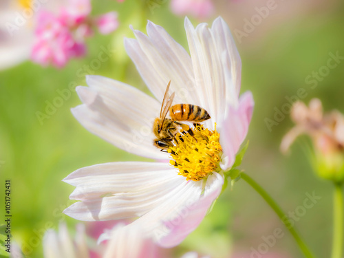 © STOCK THE WORLD, Obraz premium 秋の公園や花壇を彩るコスモスのある風景。コスモスの蜜を集めに来たミツバチ。午後の眩しい光に包まれる様子。背景。自然風景素材。心象風景。