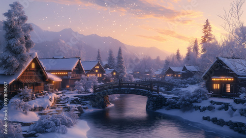 © bephoto, Fototapeta premium 冬の日本村と氷の風景