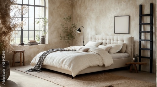 © chic designs, Obraz premium エレガントなモックアップポスターフレームを使用した居心地の良いベッドルームのインテリアデザイン