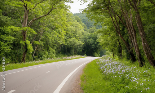 Fototapeta premium 시골길 도로 옆 나무와 꽃 예쁜 시골길