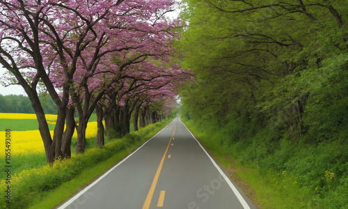 Fototapeta premium 시골길 도로옆에 꽃과 나무가 예쁘다 쾌적한도로