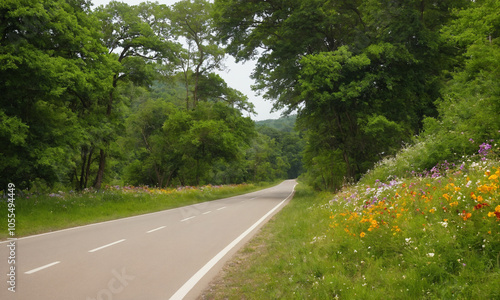 Fototapeta premium 시골길 도로옆 예쁘게 나무와 꽃이 만발해있다.