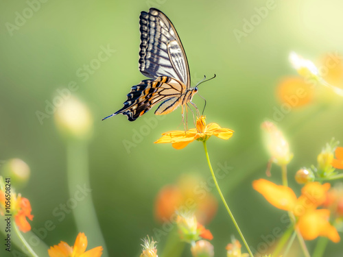 © STOCK THE WORLD, Obraz premium 秋の公園や花壇を彩るコスモス(キバナコスモス)のある風景。コスモスとアゲハチョウ。背景。自然風景素材。