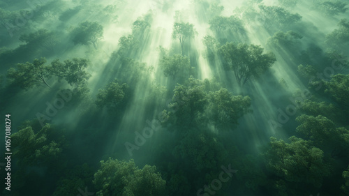 © bephoto, Fototapeta premium 霧に包まれた夜明けの古代の森