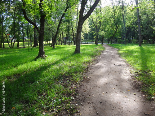 © keleny, Obraz premium Парк с зелеными деревьями и травой летним солнечным днем