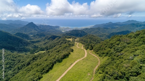 Naklejka premium 緑豊かな渓谷と遠くの海の水平線を見渡す美しい山道