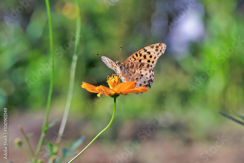© Satoshi, Fototapeta premium コスモスとツマグロヒョウモン