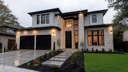 © chic designs, Obraz premium 2階建てのデザインとエレガントな照明を備えたモダンで豪華な家