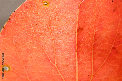 © tenpadasi, Fototapeta premium 秋・紅葉して赤く染まった木の落ち葉のアップ・マクロ撮影 季節のテクスチャー背景 葉の葉脈汚れシミ 自然の質感