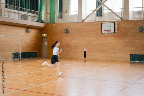 © RYH, Obraz premium 学校の体育館の中で走る体操着姿の女子生徒
