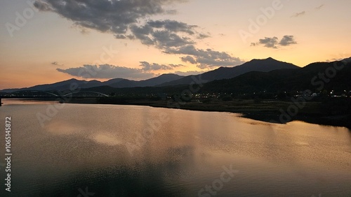 Obraz premium 경기도 양평의 북한강과 철교의 석양 전망