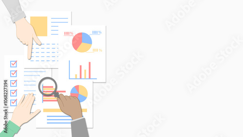 Fototapeta premium 資料をチェックする様々な人の手のイラスト 書類の色はカラフル 左側バージョン