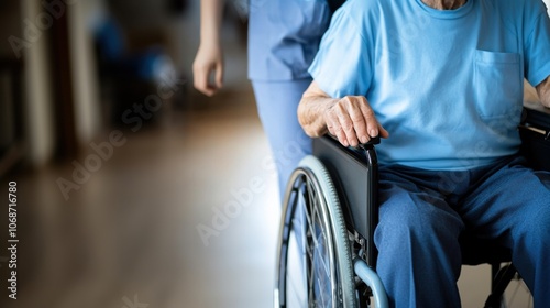 © chic designs, Fototapeta premium 屋内で介護者と一緒に車椅子に乗った高齢者:思いやりのある医療支援
