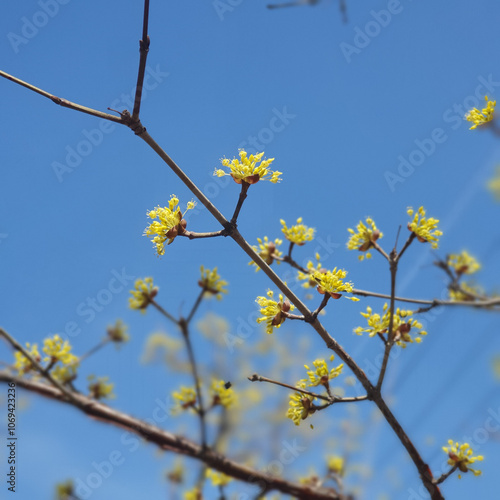 © 검정색, Obraz premium 파란 하늘 아래 만개한 산수유