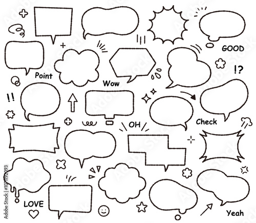 © Kuman, Fototapeta premium 吹き出しとアイコンのイラストセット 素材 見出し 飾り罫 ふきだし サンバースト あしらい ペン画風