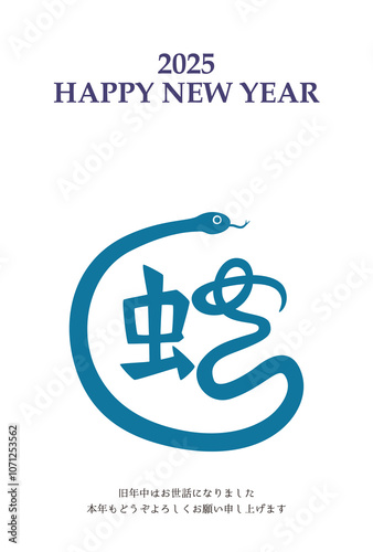 Fototapeta premium 2025年 巳年 年賀状テンプレート 漢字イラスト 青 縦