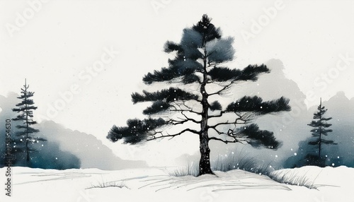 Obraz premium 소나무에 소복하게 쌓인 눈 동양화
