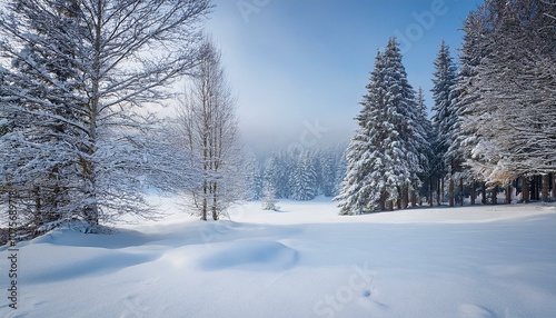 Fototapeta premium 雪が積もった静かな森。遠くの木々と広がる雪景色が、冬の穏やかな雰囲気を作り出すシンプルなデザイン。