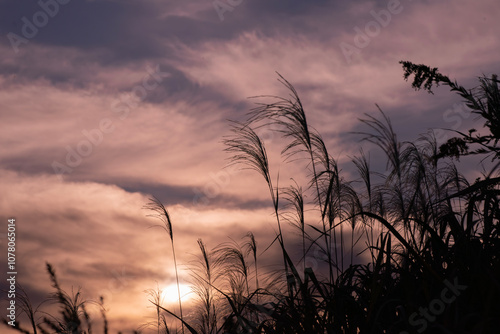 Obraz premium 秋の夕暮れ, グラデーションの空とススキのシルエット