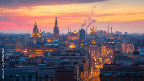 Obraz premium 夕暮れに蒸気を放つ火力発電所の壮大な風景