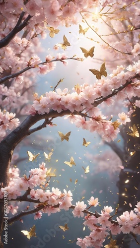 Obraz premium 桜の花が満開の木々の間を飛び交う金色の蝶々たち。光が柔らかく差し込み、幻想的でロマンチックな雰囲気が漂う。